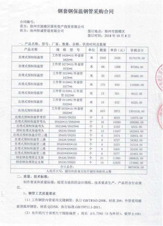 徐州市鼓楼区国有资产投资有限公司与我公司签署钢套钢直埋保温管供应合同